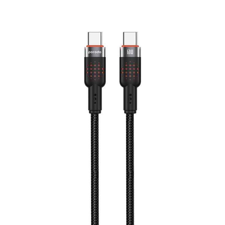 Porodo Braided Type-C to Type-C Cable with 60W Power Delivery, 1.2m Cable Length, 480Mbps Transfer Speed, More than 15,000 Bends Lifespan, Tangle-Free Design - Black