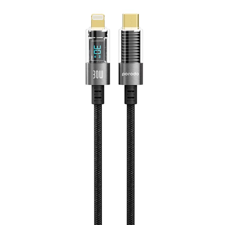 Porodo Transparent Braided USB-C to Lightning Cable for Charging & Data Transferring, High-Grade Components, Tangle Free, 480 Mbps Data Transfer Speed - Black