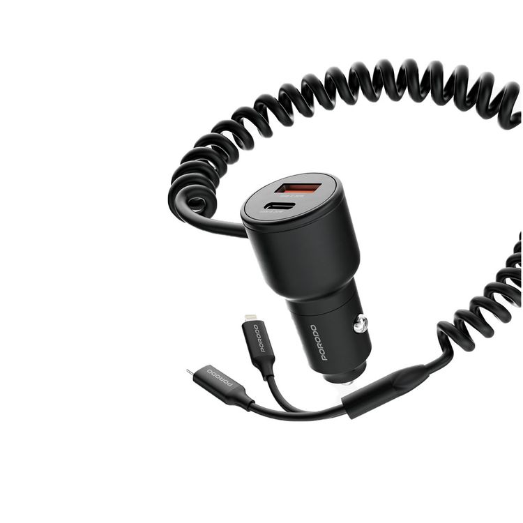 Porodo Dual Port Car Charger with Integrated C+L Cables, Adaptable, Simultaneous Charging, Universal Compatibility, 1.5m Cable Length - Black