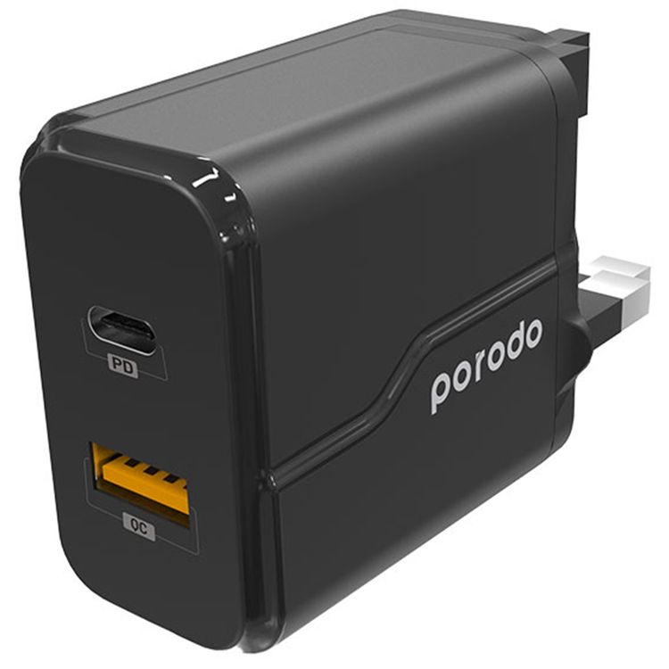 Porodo USB-C Adapter comes with 18W Power Delivery. This ultra-compact wall charger is enough small to carry around with you without being worried about managing your spaces. Use this full-speed charger to save your time, in another hand, you can charge your smartphone from 0 to 60% just in 30 minutes. Notice that the charging time is dependent on your device usage.Super compact and fast, 18W wall charger will help you to speed up your charging with a protective mechanism for safety. Porodo Dual-port USB-C PD and USB-A QC wall charger is super-compact and is designed to charge in a fast mood with 18W power delivery and 2 Pin Plug type. This wall charger has been designed to be protective against over-charging, and over-heating, and is made with fire-resistant material. Compatible with cellular phones.