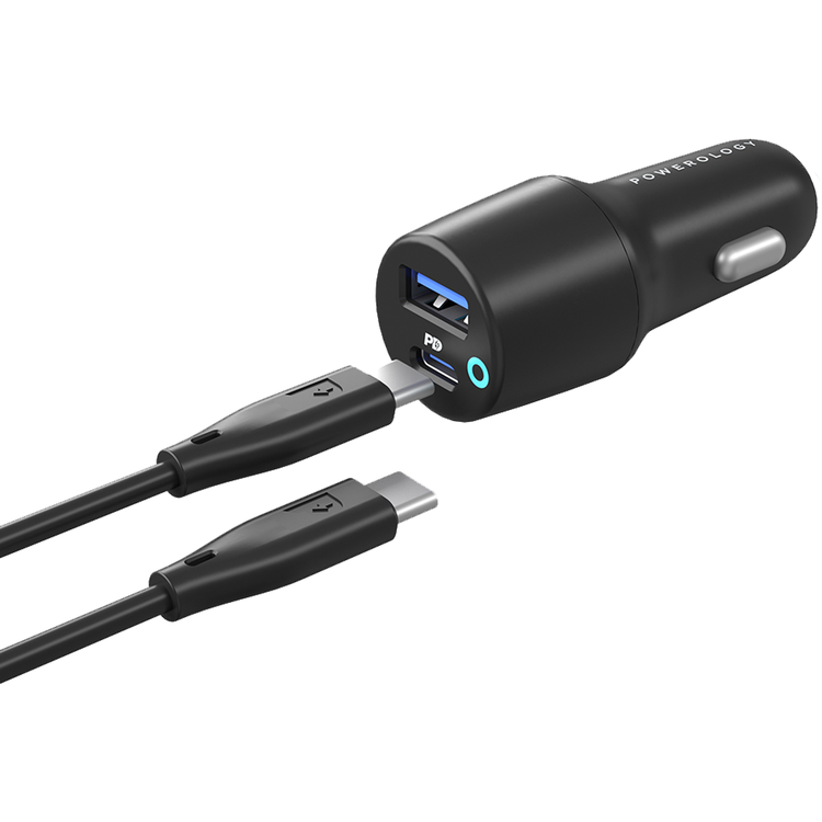Powerology 53W Ultra-Quick Car Charger Dual Output with USB-C to USB-C Cable - Black