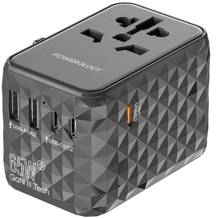 Powerology 65W PD Universal Multi-Port Travel Adapter with Triple USB-C Outputs, Universal Plugs, Combined Output Mode, Lightweight & Portable, Travel Friendly - Gray