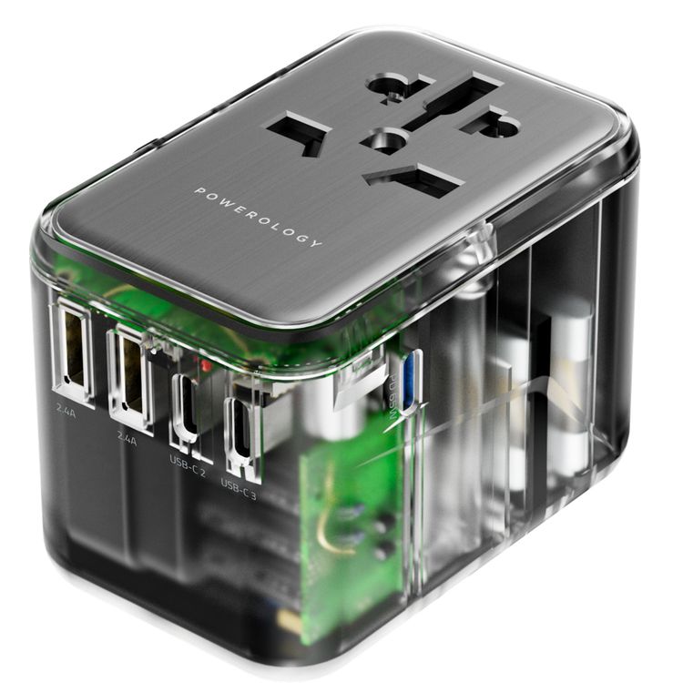 Powerology 65W PD Universal Multi-Port Travel Adapter with Triple USB-C Outputs, Universal Plugs, Combined Output Mode, Lightweight & Portable, Travel Friendly - Transparent / Gray