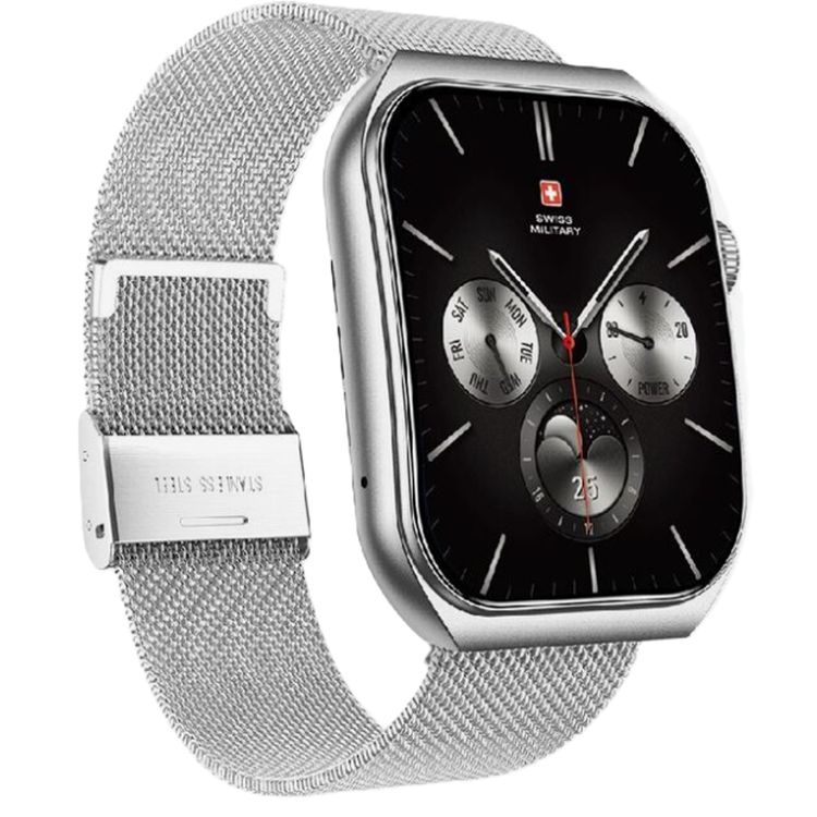Swiss Military Alps 3 Smartwatch, 1.96" AMOLED Curved Glass Display, 1 Week Battery Life, Wireless Charging, Water Resistance, Receive and Makes Calls - Steel Silver Strap