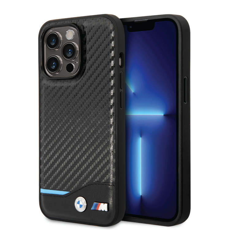 BMW M Collection Magsafe Compatibility PU Carbon Case with Bottom Horizontal Blue Line iPhone 14 Pro Compatibility - Black