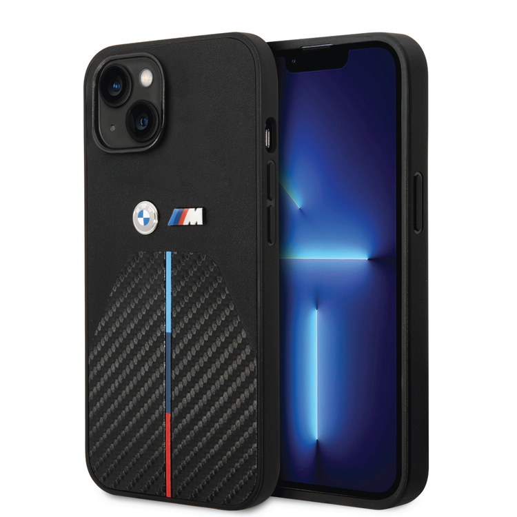 BMW M Collection Quilted PU Carbon Case with Hot Stamped Tricolor Stripe & Metal Logos iPhone 14 Plus Compatibility - Black
