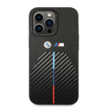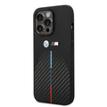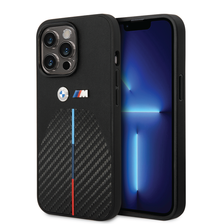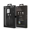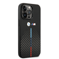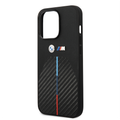 BMW M Collection Quilted PU Carbon Case with Hot Stamped Tricolor Stripe & Metal Logos iPhone 14 Pro Max Compatibility - Black