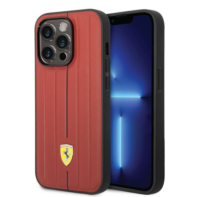 Ferrari Leather Case With Embossed Stripes & Yellow Shield Logo - iPhone 14 Pro - Red