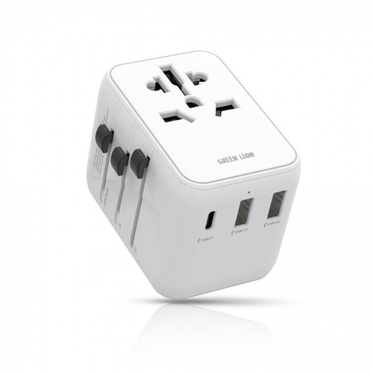 Green Lion 20W PD Universal Travel Adapter with Carrying Pouch, Dual USB-A Ports, US, AU, EU & UK Plug Compatibility, Short-Circuit Protection & Overheat Protection - White