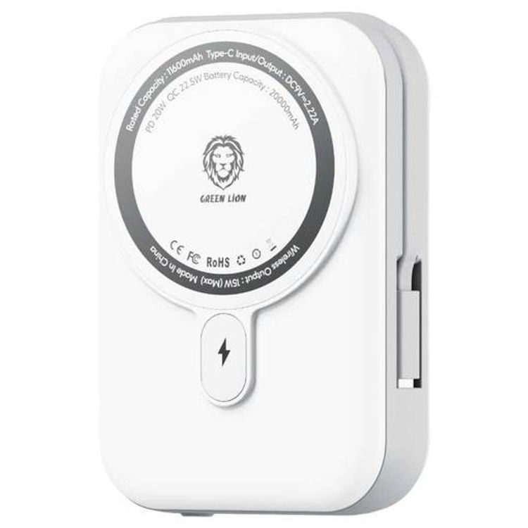 Green Lion Monaco MagSafe 20000mAh Power Bank with Built-in Lightning Cable, Wireless Charging Compatibility, 22.5W PD & QC Output, 15W Wireless Output, LCD Display - White