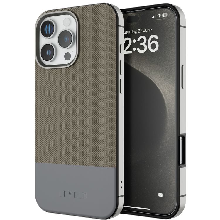 Levelo Cuir Two Tone Leather Case For iPhone 16 Pro Max, Durable, Compact Design, MagSafe Compatible, Hybrid Case, Impact-Resistant Corners , Aluminum Bumper Finish, High Quality Material - Gray