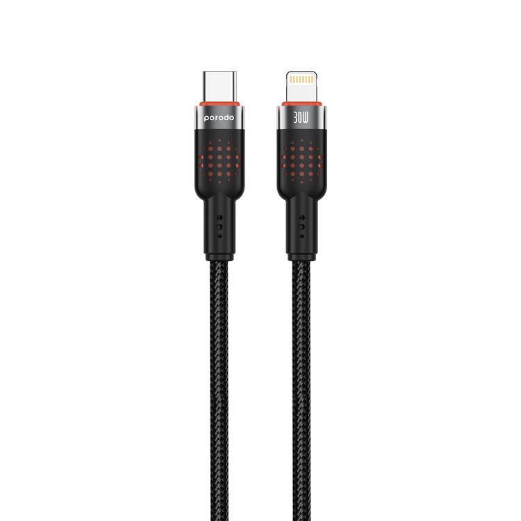 Porodo Braided Type-C to Lightning Cable with 30W Power Delivery, 1.2m Cable Length, 480Mbps Transfer Speed, More than 15,000 Bends Lifespan, Tangle-Free Design - Black