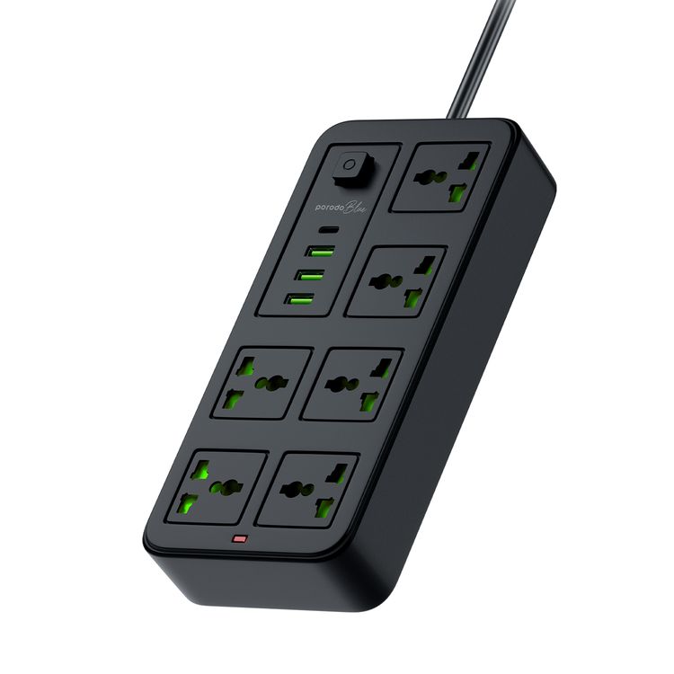 Porodo Blue 6 AC Universal Sockets Power Strip with Type-C, 3 USB-A UK, 3m Cable Length, Universal Sockets - Black
