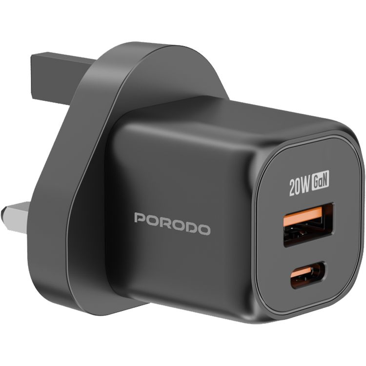 Porodo Dual Port Wall Charger, 18W USB QC3.0, PD 20W, UK Plug, Over-Heat Protection, Simultaneous Charging - Black