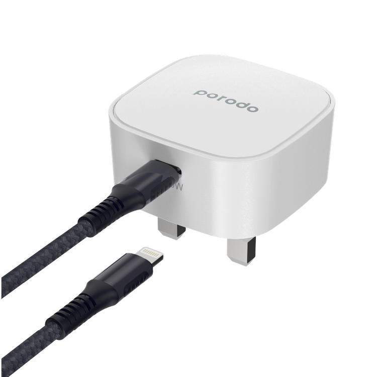 Porodo Super-Compact Fast Wall Charger UK with Braided Type-C to Lightning Cable - White