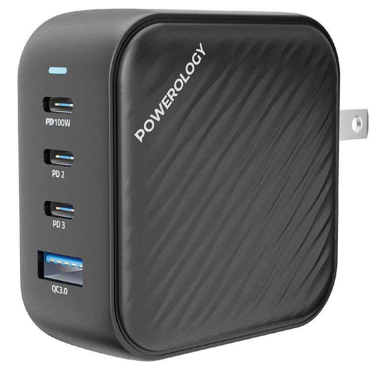 Powerology 100W Triple PD GaN Charger with EU & UK Plug, 3 USB-C Ports & USB-A Port, Built-in Safeguard, Multi Device Charging, Fast Charge, Laptop Charger - Black