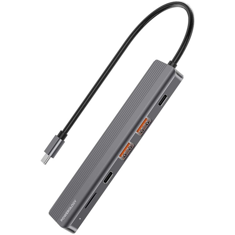 Powerology 6-in-1 USB-C Hub HDMI Type-C 100W PD USB MicroSD, Ultra HD HDMI Port, Charge & Data - Gray