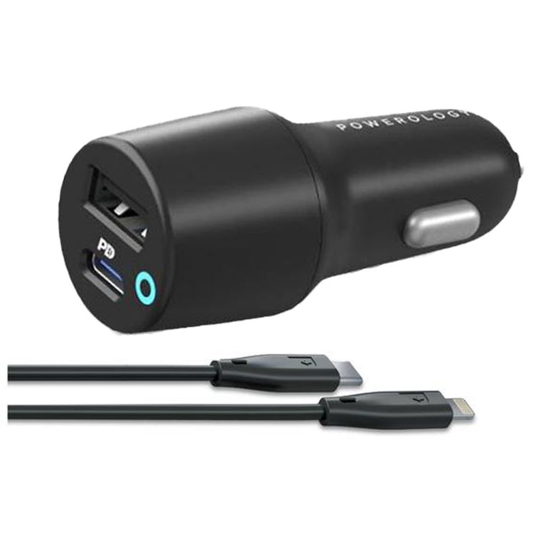 Powerology Dual Port Car Charger with USB-A & USB-C Ports, PD 35W, 47W Total Power, USB-C to Lightning Cable, 1.2m Cable Length, Fast Charging - Black