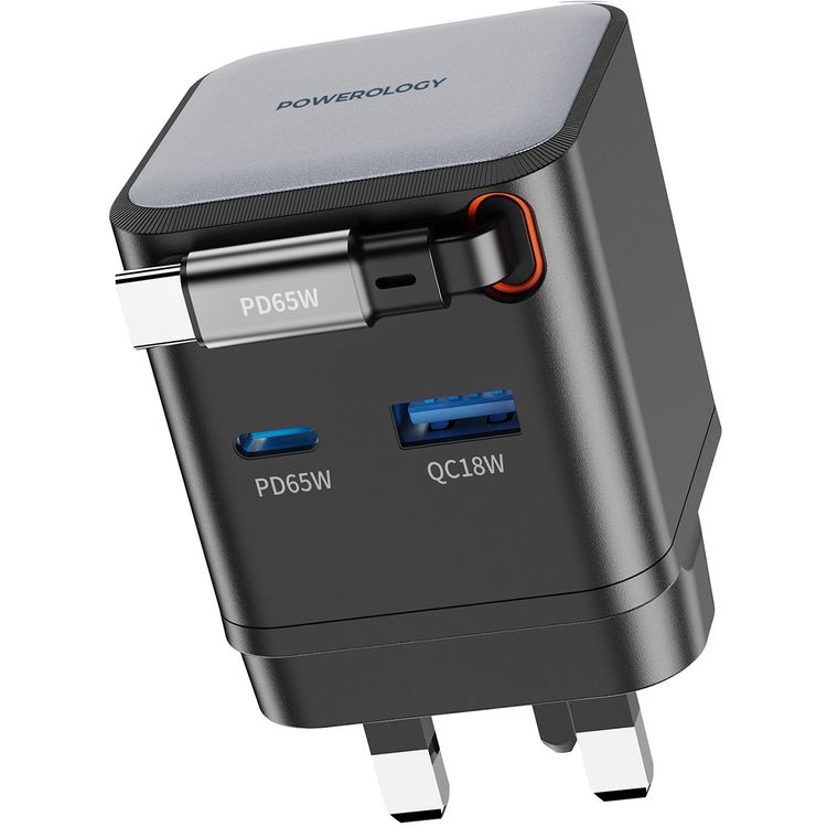 Powerology Dual Port Retractable GaN Charger, Built-in Safeguards, 3-Device Charging, 65W Power Delivery, Fire Proof Material, Patented Design, 75cm Retractable Type-C Cable - Black