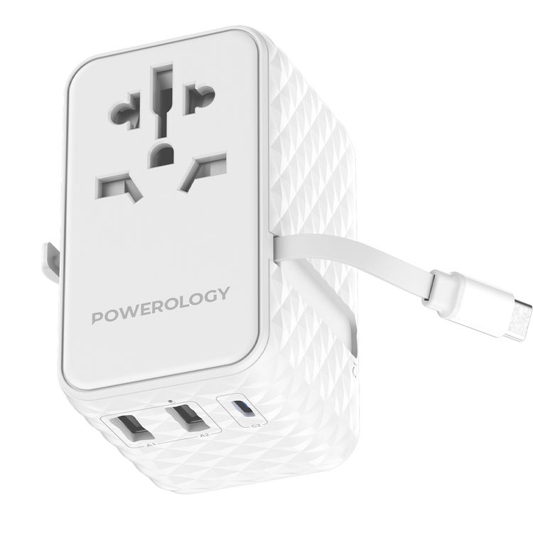 Powerology GaN 20W PD Universal Adapter with Retractable Type-C Cable, Simultaneous Charging, Includes Spare Fuse, Built-In Safeguard - White