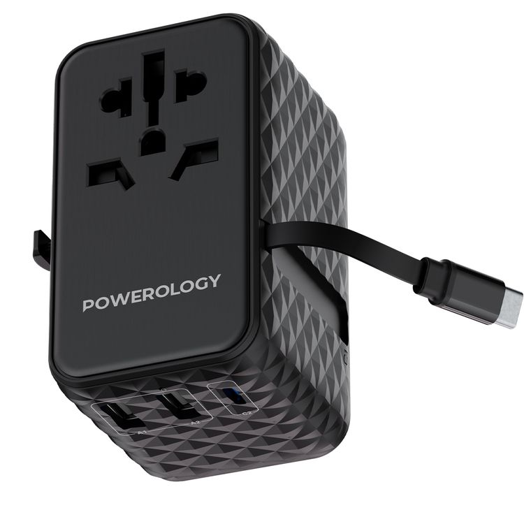 Powerology GaN 20W PD Universal Adapter with Retractable Type-C Cable, Simultaneous Charging, Includes Spare Fuse, Built-In Safeguard - Black