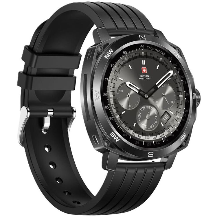 Swiss Military DOM4 Smartwatch, 1.43" AMOLED Display, Built in Compass, Bluetooth Calling, Workout Detection - Black With Black Silicon Strap
