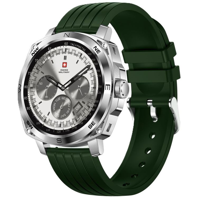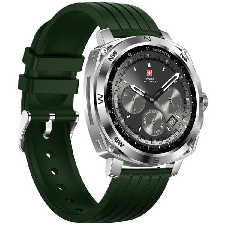 Swiss Military DOM4 Smartwatch, 1.43" AMOLED Display, Built in Compass, Bluetooth Calling, Workout Detection - Silver with Green Silicon Strap